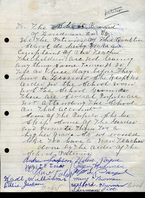 This document includes a letter of petition dated June 18, 1947, from Mrs. Gertrude Johnson, President of the Parents Teachers League, with petitioners' signatures, and a typewritten response from O.L. Emerick, Division Superintendent. In his June 20, 1947, response, Emerick states that the school board would not find it possible to honor this request, as another teacher has already been assigned.