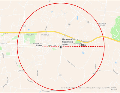 It's estimated that the maximum distance students would have walked to this school is 3 miles one way. The graphic shows the area from which students may have walked to this school.